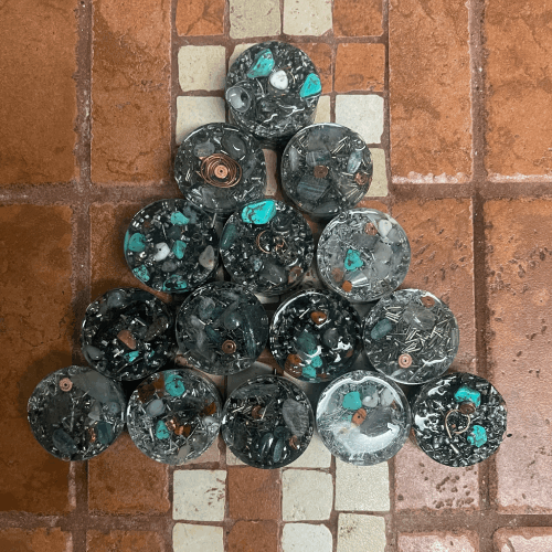 These are made with the specifications of Wilhelm Reich and Don and Laura Croft with love by hand, individually. They consist of at least 50% metal, crystals, shungite and shungite powder, precious stone, amythist, quartz and resin. They are also infused with Plasma from a TZLA machine. Perfect for neatralizizinf emf radiation on routers, in pocket, purse, or purification of water. So many others uses. Can never have enough. Can also do your part by throwing them near the towers.